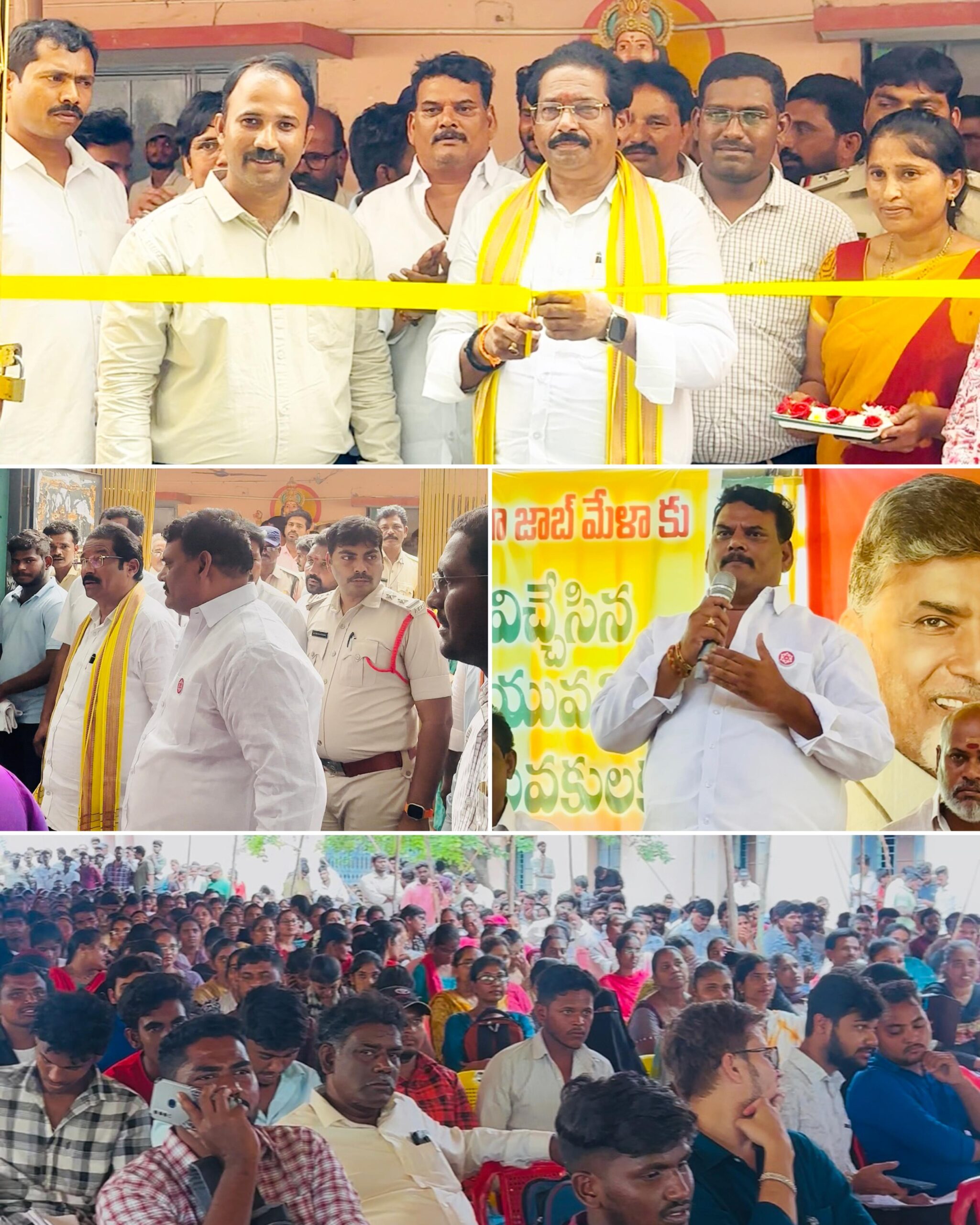 పట్టణంలోని ప్రభుత్వ జూనియర్ కళాశాల ఆవరణలో ఆంధ్రప్రదేశ్ నైపుణ్య అభివృద్ధి సంస్థ ఆధ్వర్యంలో శనివారం ఉదయం ఏర్పాటుచేసిన మెగా జాబ్ మేళకు ముఖ్యఅతిథిగా ప్రభుత్వ చీఫ్ విప్, సీనియర్ శాసనసభ్యులు శ్రీ జీవి ఆంజనేయులు గారు & వినుకొండ నియోజకవర్గం జనసేన పార్టీ సమన్వయకర్త శ్రీ కొంజేటి నాగ శ్రీను రాయల్ గారు హాజరై జాబ్ మేళాను ప్రారంభించారు. రాష్ట్రంలో 20 లక్షల మందికి ఉద్యోగ,ఉపాధి కల్పన లక్ష్యంగా ముఖ్యమంత్రి చంద్రబాబునాయుడు గారు ముందుకు వెళ్తున్నారని తెలిపారు. దీనిలో భాగంగానే వినుకొండలో మెగా జాబ్ మేళా నిర్వహించి వందలాదిమంది నిరుద్యోగ యువతీ, యువకులకు ఉద్యోగ ఉపాధి కల్పించడం జరిగిందన్నారు. స్కిల్ డెవలప్మెంట్ ద్వారా నిర్వహించే జాబు మేళ ను నిరుద్యోగులు సద్వినియోగం చేసుకోవాలని చీఫ్ విప్ జీవి గారు కోరారు. ఈ కార్యక్రమంలో కూటమి నాయకులు, తదితరులు పాల్గొన్నారు.