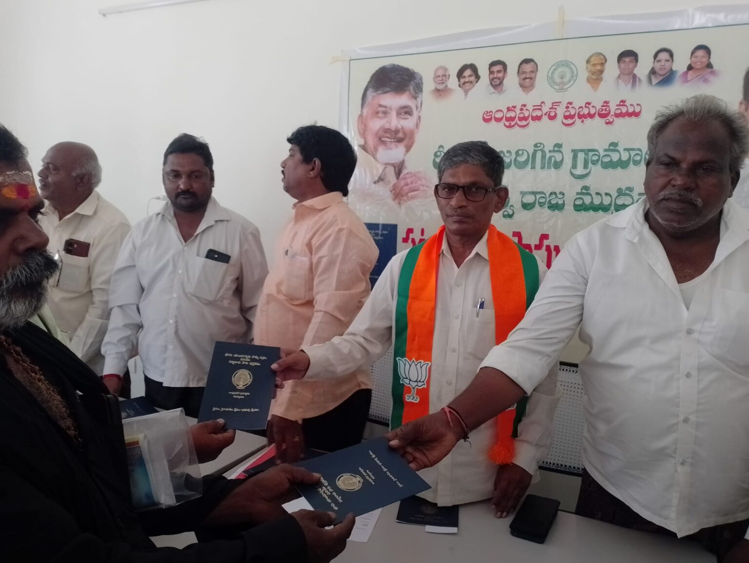 చిలకలూరిపేట నియోజకవర్గ ఎడ్లపాడు మండలం కారుచోల గ్రామ కార్యాలయం లొ కూటమి నాయకులు తో కలిసి పట్టాదారు పాసు బుక్కు పంపిణీ కార్యక్రమం లొ పాల్గొన్న బిజెపి నాయకులు