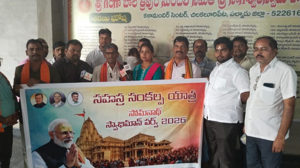 సుప్రసిద్ధ సోమనాథ్ ఆలయంపై 1025 జనవరిలో గజనీ మహమ్మద్ దాడి చేసి 2026 నాటికి వెయ్యేళ్లు కాగా.. 1951లో డా. బాబూ రాజేంద్ర ప్రసాద్ చేతుల మీదుగా ఆలయ పునర్నిర్మాణం జరిగి 75 ఏళ్లు (అమృతోత్సవం) పూర్తయింది. ఈ చారిత్రక సందర్భాన్ని పురస్కరించుకుని ప్రధాని నరేంద్ర మోదీ జనవరి11న సోమనాథ్ క్షేత్రంలో సహస్ర సంకల్పయాత్ర ను ప్రారంభిస్తున్నారు. ఈ సందర్భంగా రాష్ట్రంలోని బిజెపి నాయకులు, కార్యకర్తలు అందరూ సోమనాథ్ స్వాభిమాన్ పర్వ్ పేరుతో నిర్వహించే కార్యక్రమంలో ఉత్సాహంగా పాల్గొనాలని పిలుపునిచ్చారు ఈ కార్యక్రమంలో పాల్గొన్న వారు పల్నాడు జిల్లా ఉపాధ్యక్షులు మల్లెల శివ నాగేశ్వరరావు, పల్నాడు జిల్లా కిసాన్ మోర్చా అధ్యక్షులు నెల్లూరి ఈశ్వర్ రంజిత్ పల్నాడు జిల్లా కార్యవర్గ సభ్యులు వరికూటి నాగేశ్వరరావు, బీజేవైఎం స్టేట్ ఎగ్జిక్యూటివ్ నెంబర్ పులిగుజ్జి మహేష్, పట్టణ అధ్యక్షులు కోట పవన్ కుమార్ గాంధీపట్టణ ప్రధాన కార్యదర్శి సింగిరేసు పోలయ్య పట్టణ ఉపాధ్యక్షులు కోట చంద్ర నాయుడు మాజీ జిల్లా కార్యదర్శి కస్తూరి వెంకటేశ్వర్లు. ఎడ్లపాడు మండల అధ్యక్షులు తులాబందుల సత్యనారాయణ ఎడ్లపాడు కార్యదర్శి దాట్ల రాజు జిల్లా సోషల్ మీడియా ఇంచార్జ్ వంశీ వంకాయలపాటి,పట్టణ మీడియా ఇన్చార్జి రావికింది రామకృష్ణ, చిలకలూరిపేట రూరల్ మండలం అధ్యక్షులు పఠాన్ యాసిన్ చిలకలూరిపేట పట్టణ ఉపాధ్యక్షులు హనుమాన్ సింగ్ పట్టణ యువజన అధ్యక్షులు తెల్లపాటి మనోహర్ పట్టణ ఉపాధ్యక్షులు చిలకలూరిపేట పట్టణ మైనార్టీ వచ్చే అధ్యక్షులు సుభాని షేక్ పట్టణ కార్యదర్శి మాచర్ల శ్రీను మండల మహిళా అధ్యక్షురాలు మక్కా దుర్గా ఎడ్లపాడు మండల యువ మోర్చా ప్రధాన కార్యదర్శి నక్క శ్రీనివాసరావు ఎడ్లపాడు మండల యువమోర్చా అధ్యక్షులు మల్లాకోటి బిజెపి నాయకులు బుజ్జి బాబు కోమటి వాసు తదితరులు పాల్గొన్నారు.