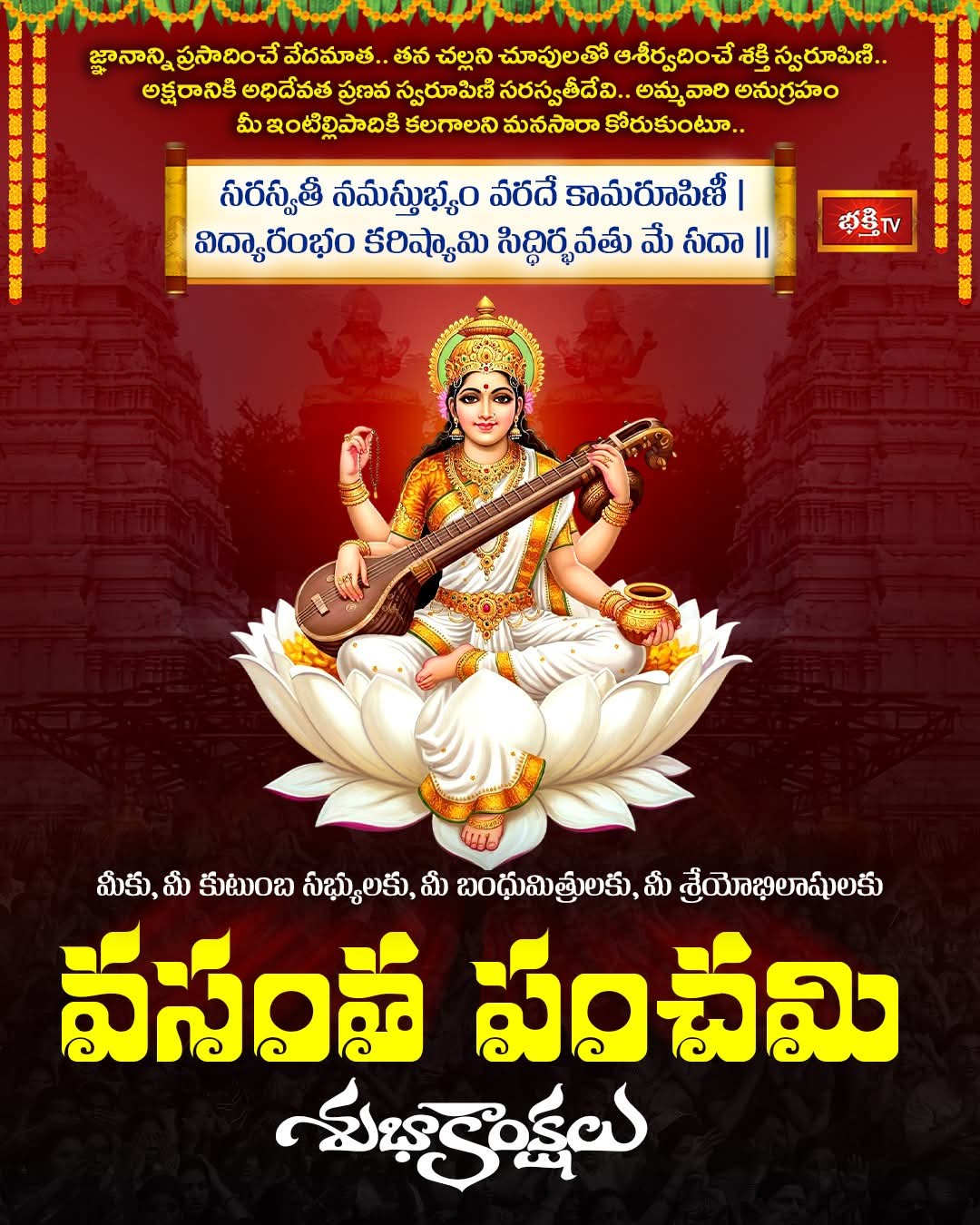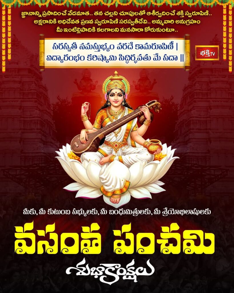 జ్ఞానం కొరవడితే.. జీవితం చీకటి మాయమవుతుంది. అలాంటి అజ్ఞానాన్ని తొలగించి మనకు సన్మార్గాన్ని చూపేది సరస్వతీదేవి తత్వమే. సకల కళలకు ఆదిదేవత అయిన సరస్వతీదేవిని పూజించడం ద్వారా లౌకిక, అలౌకిక జ్ఞానం ప్రాప్తిస్తుంది.అటువంటి చదువుల తల్లి అనుగ్రహం మీపై ఉండాలని మనసుపూర్తిగా కోరుకుంటూ హిందూ బంధువులు అందరికి వసంత పంచమి శుభాకాంక్షలు.